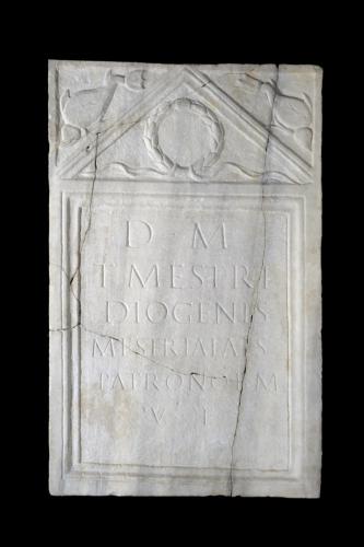 - ISCRIZIONI nello specchio della stele - D(is) M(anibus)/ T(iti) Mestri/ Diogenis/ Mestria Lais/ patrono b(ene) m(erenti)/v(iva) f(ecit) - Mestria Lais - lettere capitali apicate - a incisione - Latina