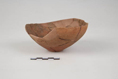 Coppa con orlo appiattito, leggermente obliquo verso linterno, vasca emisferica con pareti rastremate verso il fondo, fondo piatto. L'argilla è di colore arancio con piccoli inclusi calcarei, ferrosi e micacei, mal cotta, superficie ruvida.