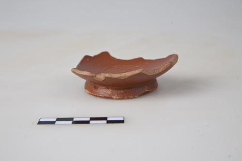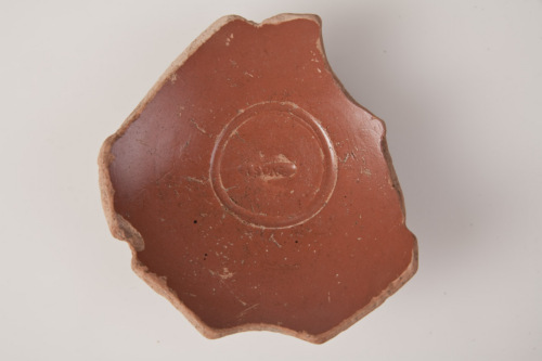 Fondo di coppetta con piede ad anello troncoconico, a profilo angoloso, al centro del fondo esterno, umbelico di tornitura, fondo interno concavo, al centro cerchio inciso o impresso, al centro del quale è il bollo integro su riga unica in planta pedis destra ASPAS = Aspastus C. Vibienus. Traccia di cerchio inciso sulla parete esterna. L'argilla è di colore arancio, la vernice è rosso-bruna, coprente e semibrillante.