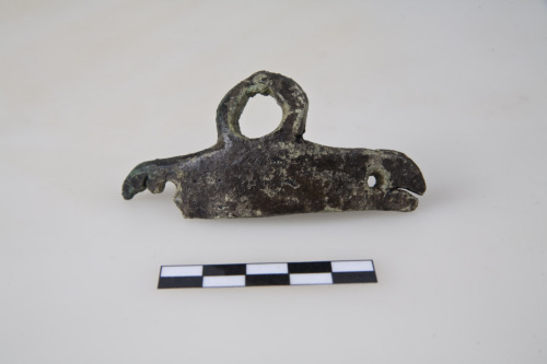 Occhiello dellattacco del manico di una situla in bronzo, massiccia lamina rettangolare incurvata e con estremità stondate, e con due forellini laterali per essere fissata al bordo della situla; superiormente al centro, è fissato un anello lievemente rientrante per laggancio del manico.