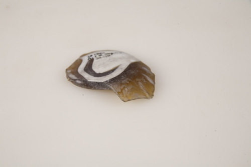 Frammento di fondo di coppa "zarte rippenschalen" con parete decorata da costolature verticali, fondo concavo. L'inizio della produzione di questo tipo di coppe si fa risalire all'età augustea, ma il momento di maggior espansione si ha in periodo tiberiano-claudio, poi decresce nella seconda metà del I d.C. e si arresta allinizio del II d.C., sono distribuite prevalentemente in tre aree: territorio del Ticino, valle del Reno, zona di Aquileia con territori di Aquileia e costa dalmata, recentemente si sono trovate attestazioni anche nella Narbonese e nel bacino del Rodano, forse uno dei centri di produzione poteva essere Aquileia, in Veneto si hanno attestazioni prevalentemente nella zona del veronese e di Adria. Il vetro è di colore giallo ambrato, filamento bianco nelle costolature e nel fondo, opalescente.