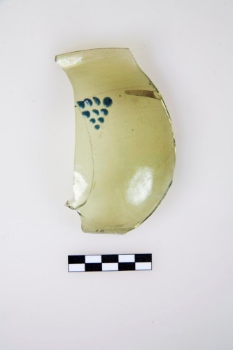 Frammento di parete con parte di orlo e di fondo di bicchiere "nuppenbecher" con corpo conico, breve orlo ricurvo verso linterno tagliato e levigato, fondo piatto, decorazione a rilievo sulla parte superiore della parete, sulla spalla, costituita da gocce di vetro blu disposte a triangolo equilatero con il vertice rivolto in basso e 4 gocce per lato. In prossimità di questa decorazione è una applicazione color argento a forma di punta lanceolata. Il vetro è di colore verde-oliva, trasparente.
