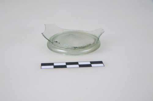 Fondo di coppetta con piede ad anello a profilo arrotondato, pareti a profilo convesso, al centro del fondo esterno del piede, lievemente decentrata, pronunciata concavità conica, probabile traccia dellalloggio del pontello durante la lavorazione. Il vetro sottilissimo è di colore verde chiaro, trasparente.