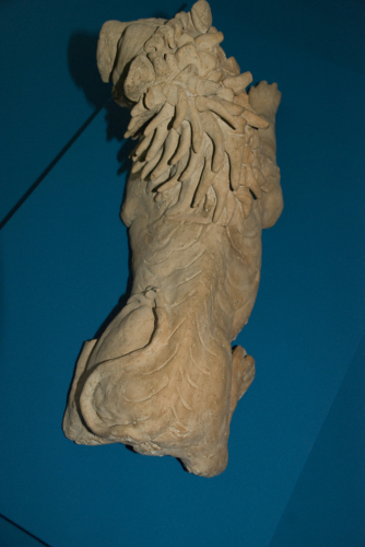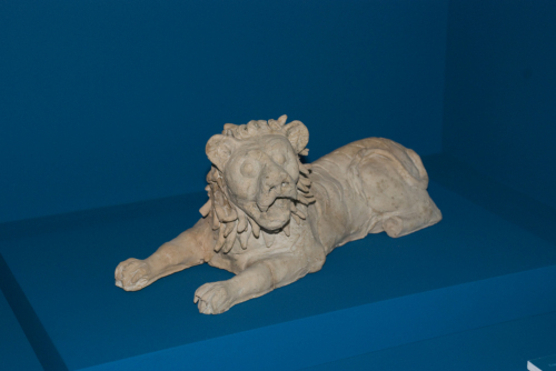 Leoncino in terracotta utilizzato come ornamento di fontana da giardino. L'animale è raffigurato accovacciato, col ventre piatto, la criniera a ciocche separate, il muso rivolto verso sinistra, con le fauci spalancate e la bocca forata per il passaggio del condotto.