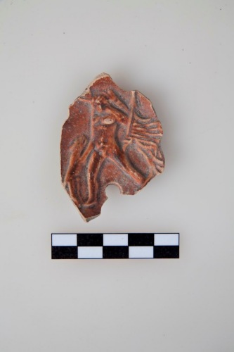 Frammento di disco figurato rappresentante Atteone assalito da un cane: Atteone stante verso s. con lancia nella s., braccio d. sollevato armato del pedum nellatto di difendersi dal cane che lo assale, clamide svolazzante poggiata sul braccio s. Traccia del foro di alimentazione, più della metà del foro. Tracce di impronte digitali sulla parete interna. L'argilla è di colore giallastra, la vernice è rosso-bruna, parete molto sottile.