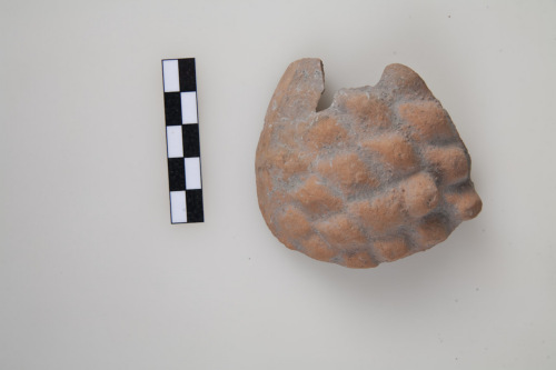 Lucerna a forma di pigna con squame in rilievo, romboidali. L'argilla è di colore arancio chiaro.
