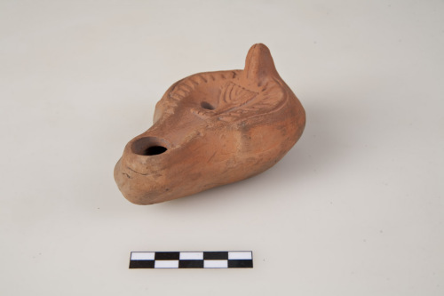 Lucerna c.d. africana o cristiana con serbatoio biconico, carenato, ansa triangolare, piena, verticale, con incisione longitudinale superiore, spalla piatta delimitata da scanalatura con decorazione a tacche trasversali profondamente incise, al centro del disco, un candelabro a 7 braccia, a rilievo, al centro, ai lati dello stelo del candelabro, 2 fori di alimentazione, canale aperto con ampio foro di bruciatura, fondo leggermente concavo delimitato da scanalatura che continua sul serbatoio verso la presa diramandosi in 3 scanalature parallele. L'argilla è di colore rosso arancio, la vernice è arancione chiaro, macchie grigiastre sul fondo.