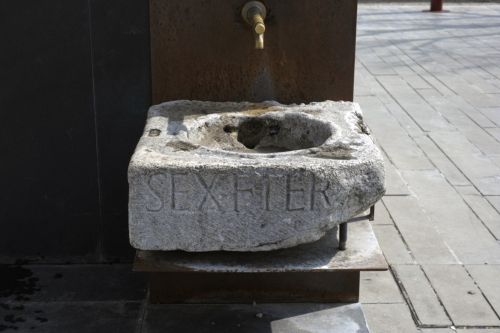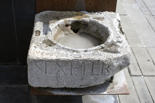 Urna cineraria quadrangolare iscritta, riutilizzata come vasca di una fontana moderna. Sul lato superiore, completamente liscio per l'usura, è ricavata una cavità circolare funzionale all'inserimento dell'urna vera e propria, con bordo rilevato dal profilo arrotondato; a sinistra è presente un incasso rettangolare per grappa, attualmente riempito di malta cementizia moderna. All'interno della cavità, nella parte posteriore, è stata ricavata un'apertura per l'inserimento del tubo moderno dell'acqua, a fianco della quale si distinguono due fori paralleli. Le facce laterali sono lavorate a scalpello e martellina, mentre il lato posteriore, in parte sbozzato, è stato segato per il riutilizzo moderno. Sulla fronte, lavorata a gradina, è inciso il nome del defunto su una sola riga.
