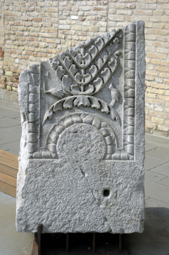 Blocco di architrave modanato con fasce piatte aggettanti su un lato e una doppia fila di atragali e perline alternati a fasce piatte dall'altro. La faccia inferiore(soffitto) è caratterizzata da una specchiatura rettangolare con imposta semicircolare per capitello; la parte centrale è profilata da un kyma con fogliette a solcatura centrale separate da fogliette lanceolate appiattite e decorata con un cespo d'acanto a foglie corte e cuoriformi; a lato, uno sopra l'altro, sono raffigurati due uccelli, di cui uno presenta un becco molto allungato (una cicogna?). A sinistra della specchiatura un incasso a sezione quadrata per la messa in opera.