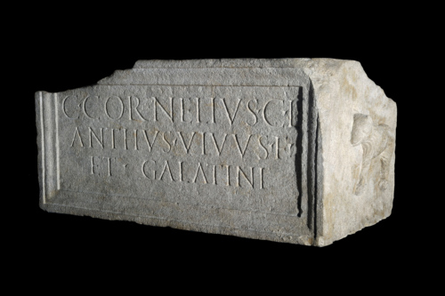 - ISCRIZIONI fronte (all'interno dello specchio epigrafico) - C(aius) Cornelius C(ai) l(ibertus)/Anthus vivus f(ecit) et Galatini - lettere capitali - a incisione - Latina