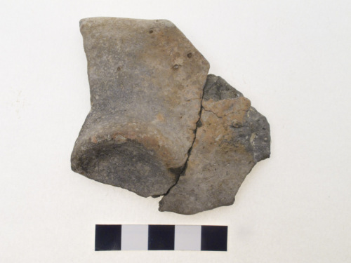 frammento di orlo arrotondato pertinente ad uno scodellone a profilo troncoconico; al di sotto dell'orlo è presente una presa costituita da un cordone liscio e arcuato ispessito nella parte centrale; superfici lisciate
