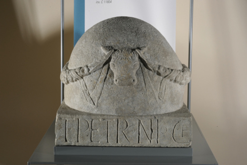 Coperchio di urna cineraria quadrata, formato da un plinto parallelepipedo sormontato da un cippo emisferico, decorato da un bucranio con ghirlande e festoni di fiori e frutta. Il coperchio è lavorato a gradina sulla cupola, la fronte, il retro e ai lati, dove sono anche ricavati in prossimità del margine inferiore due incassi a sezione rettangolare per fissare il coperchio con l'urna vera e propria. Sul pianto frontale del plinto, un'iscrizione su due righe indica che l'urna fu dedicata a Tito Petronio, figlio di Caio.