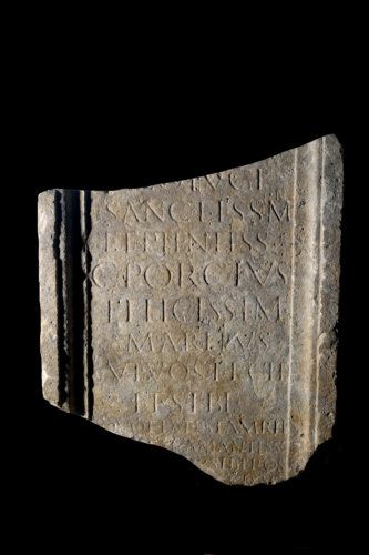 - ISCRIZIONI fronte - [- - - -] coiugi/ sanctiss(imae)/et pientiss(imae)/C(aius)Porcius/Feliciss(imus)/maritus/vivos fecit/et sibi / Quot ex testam(ento) [- - -] amantiss[(imae) et?] / sibi pos(uit)/ in [a]g(ro) p(edes) (quindecim) - C(aius) Porcius Felicissimus) - lettere capitali - a incisione - Latina