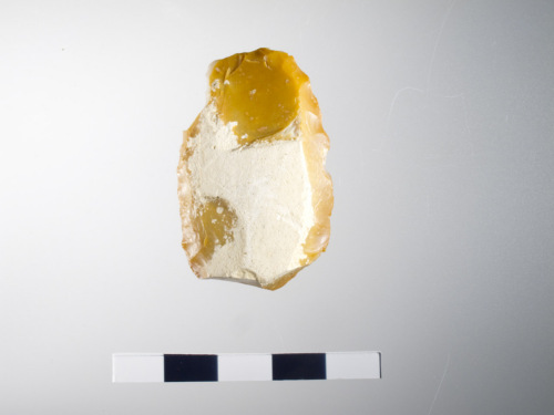 grattatoio frontale con ritocco bilaterale sopraelevato marginale diretto e ritocco complementare piatto prossimale inverso; sulla faccia dorsale si conserva il cortice