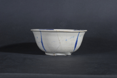 Scodella con cavetto a campana con orlo leggermente esoverso e bordo assottigliato, piede con cercine poco sviluppato. Il corpo ceramico, marnoso di colore giallino, è completamente ricoperto da smalto di colore biancastro, distribuito in modo disomogeneo e con accumuli all'esterno. All'interno del cavetto vi sono le tracce del distanziatore a tre punte utilizzato per la cottura. La decorazione pittorica, in azzurro, consta di un medaglione centrale nel cavetto, con un motivo geometrico di problematica identificazione, reso all'interno di un paese delineato in modo essenziale. La cornice presenta un motivo floreale stilizzato e la parete del cavetto è decorata da una sequenza di mezze palmette con sottili racemi, mentre l'esterno è decorato da pennellate radiali.