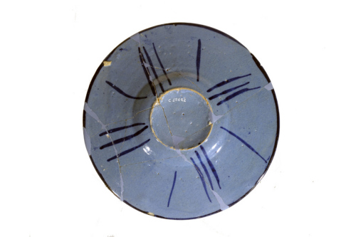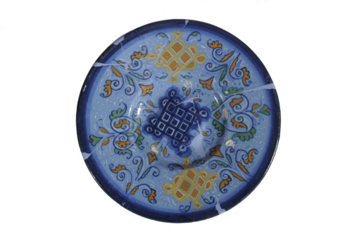 Piatto ad ampia tesa confluente su un basso cavetto a fondo leggermente concavo, bordo arrotondato ed evidenziato superiormente da una solcatura; cercine appena accennato. Il corpo ceramico, compatto e di colore giallino, completamente ricoperto da smalto color berettino. All'interno del cavetto tracce del distanziatore a tre punte utilizzato per la cottura. La decorazione, che utilizza i colori bianco, giallo, ocra, verde, azzurro scuro, si imposta su un motivo a intreccio centrale realizzato in azzurro scuro e lumeggiato di bianco; intorno, motivi vegeto-floreali stilizzati con due elementi a losanga elaborata. Il bordo è evidenziato da un'ampia fascia di colore azzurro scuro. Esterno decorato da segmenti radiali in azzurro scuro, singoli o in gruppo di tre.