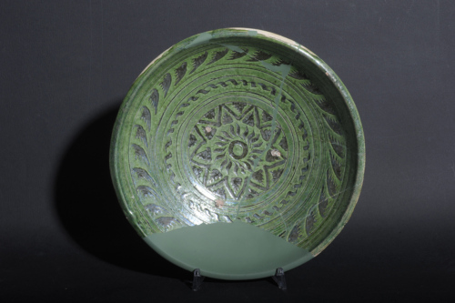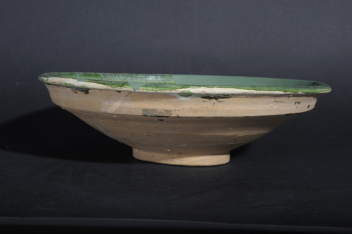 Ciotola con ampio cavetto a calotta, bordo esoverso ed ispessito sottolineato da una carenatura esterna, piede con cercine a sezione trapezoidale irregolare e leggera umbonatura. Il corpo ceramico, di argilla depurata con inclusi bianchi di varie dimensioni, è ricoperto completamente da ingobbio bianco e vetrina monocroma verde. La decorazione pittorica, in verde, consta di un grande medaglione centrale, con un fiore racchiuso da una cornice a salienti; intorno, fasce concentriche che si estendono fino al labbro, decorate con un motivo a treccia e con una sequenza di foglie.