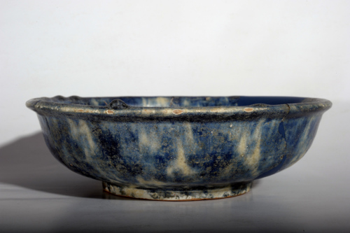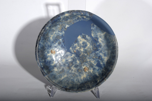 Scodella con cavetto a campana con bordo esoverso leggermente ingrossato e arrotondato, piede a cercine con sezione trapezoidale e umbone centrale. Il corpo ceramico, di impasto stracotto con minuti inclusi, è ricoperto completamente con ingobbio e vetrina. All'interno del cavetto si distinguono le tracce del distanziatore a tre punte utilizzato per la cottura. La decorazione è ottenuta a maculazione azzurro scuro.
