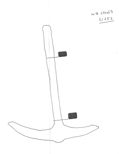 Ancora in ferro di tipo bizantino, incompleta. Il fusto è a sezione rettangolare ed è spezzato. Le marre hanno forma ad "U" molto aperta, presentano una sola unghia a forma triangolare. L'unghia è conservata completamente solo nel senso della lunghezza. L'ancora conserv il diamanre. Manca una marra e la parte sommitale del fusto.