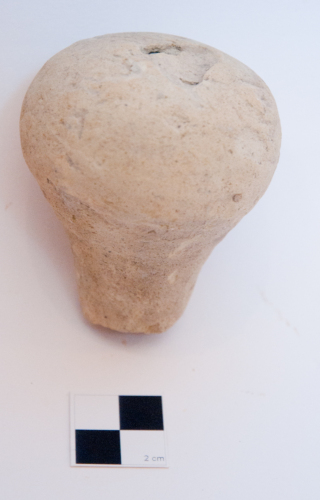 Tappo d'anfora in argilla depurata giallo-ocra, farinosa e poco dura. A forma di pera rovesciata, ha perso la parte apicale. Può assomigliare in qualche modo ad un anforisco riproducente unanfora globulare schiacciata.