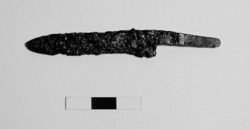 Lama di piccolo coltellino in ferro, con sezione triangolare. Il margine superiore della lama e rettilineo, mentre limpugnatura (ovvero la zona dove la lama si attaccava allimpugnatura) è rastremata. Coltelli di piccole dimensioni sono bene attestati nelle tombe femminili Magiare del Periodo della Conquista Ungherese. Una seconda lama del tutto simile a quella oggetto della scheda è nota dalla letteratura e proviene dalla medesima tomba.