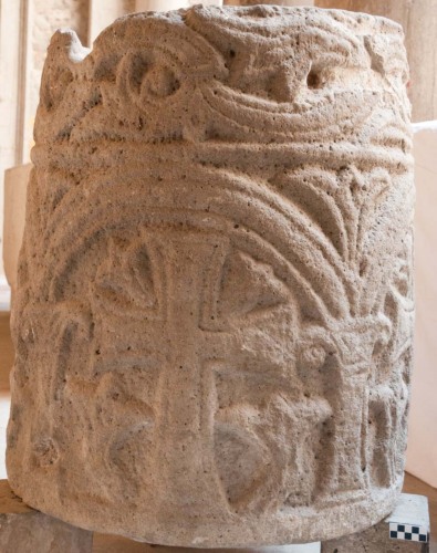 Vera da pozzo circolare in pietra dIstria, decorata a bassorilievo. La decorazione avviene in due registri sovrapposti. Il registro superiore ha una decorazione di tipo fitomorfa con un tralcio di foglie a tre punte disposte di profilo. Il tralcio e le foglie sono percorsi da solchi che corrono paralleli ai bordi scolpiti creando una decorazione su tralci e foglie del tipo a nastro a tre vimini, di cui quello centrale risulta essere l più largo. Il registro inferiore presenta una decorazione più grande inserita dentro una rappresentazione di uno spazio architettonico semplificato. Si tratta di una serie di quattro arcatelle sostenute da pilastrini e relativi capitelli. Entro ogni arco, così formato, campeggia una croce ad estremità espanse, a cui lati sorgono alberelli stilizzati e semplificati. Sopra i bracci orizzontali della croce sono rappresentati gigli semplificati che emergono dagli angoli interni della croce. I pennacchi tra un archetto e laltro sono decorati con gigli a tre punte. Tutti gli elementi del registro inferiore, come quelli del registro superiore, sono percorsi da un solco parallelo al bordo degli oggetti rappresentati creando leffetto di un nastro vimineo a tre capi, con il nastro centrale assai più ampio degli altri. Lesecuzione del bassorilievo sembra piuttosto corsiva e in alcuni casi irregolare. La vera da pozzo è esternamente a forma di tronco di cono poco rastremato, mentre allinterno è scavato un cilindro regolare di diametro di 56-57 cm. Con ogni probabilità loggetto pare essere il risultato di un re-impiego in età altomedievale di un elemento architettonico di età romana. Le dimensioni e la forma del blocco di marmo, infatti, lasciano pensare ad una base di monumento funerario. Sul registro superiore, inoltre vi sono alcuni grandi fori rettangolari, probabilmente posteriori alla decorazione di IX secolo, e relativi allaggancio di una qualche struttura presso la vera da pozzo, forse relativa allattingimento dellacqua.
