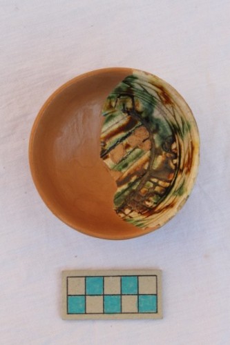 Saliera con corpo a profilo emisferico, orlo indistinto e piede a ventosa. Il reperto è rivestito all'interno e all'esterno da ingobbio graffito e dipinto, in giallo e verde, sotto vetrina piombifera. La copertura di ingobbio copre anche il fondo del piede. Sulla superficie interna la decorazione prevede sul bordo una cornice campita da una sequenza di linee oblique e parallele che delimita uno stemma raffigurato entro un "hortus conclusus". La superficie esterna è campita da una sequenza di linee verticali marcate da pennellate di colore giallo e verde. Sulla parete esterna della vasca è visibile un difetto dovuto allo stacco di un altro manufatto ceramico aderito durante la fase di cottura.