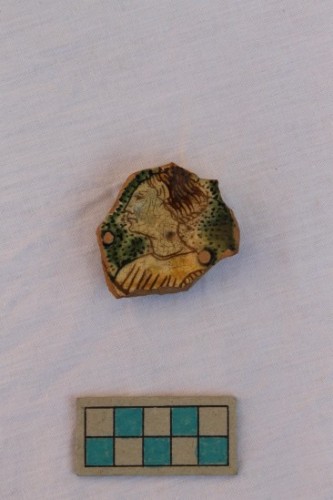 Probabile scodellina di cui si conserva il cavetto con il piede a ventosa. Il reperto è rivestito all'interno e all'esterno da ingobbio graffito e dipinto, in giallo e verde, sotto vetrina piombifera. Sulla superficie interna è presente al centro del cavetto una figura maschile rivolta a sinistra su fondo puntinato. Qui si notavo anche i segni lasciati dallo stacco del treppiede di cottura. La superficie esterna è decorata da una sequenza di linee verticali e parallele marcate da pennellate di colore giallo e verde.