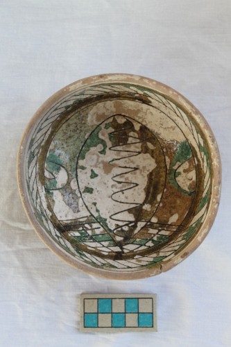 scodella con piede ad anello e fondino leggermente umbonato, corpo a profilo emisferico schiacciato, orlo diritto indistinto e labbro arrotondato. All'interno il decoro graffito è composto da uno scudo araldico stilizzato, circondato lungo i lati maggiori da due semicherchi marcati da pennellate di colore verde. Parallelamente al bordo è presente una fascia campita da lineette oblique.