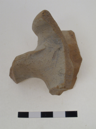 Frammento del collo con lattacco dellansa, a sezione ellittica, di unanfora globulare altomedievale, probabilmente di area dellItalia meridionale. Il frammento presenta il labbro è leggermente estroflesso, a sezione triangolare arrotondata. Largilla è di colore rosato tendente al rosso con molti inclusi bianchi e miche. Il manufatto presenta schiariture superficiali. Lansa è a bastoncello, con sezione ellittica. Sono presenti due leggere solcature sulla parte esterna dellansa.