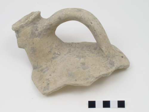 Ampia porzione di anfora del tipo globulare altomedievale, probabilmente proveniente dallarea del Mediterraneo orientale. Il frammento riguarda la parte del collo, con un ansa, all'attacco della seconda ansa e porzione della spalla. Il labbro è leggermente estroflesso a sezione circolare. Sull'ansa, a nastro, è presente una leggera insellatura. Sulla spalla si percepisce un accenno di decorazione a fascio di linee incise, purtroppo non conservata. Sotto l'attacco dell'ansa sulla spalla vi è un graffito post-cocturam recante la lettera "V". Nel punto d'attacco tra il collo e il corpo ceramico vi sono due leggere solcature. Collo a forma leggermente troncoconica. Argilla depurata di colore crema chiaro. Sono presenti Inclusi bianchi anche di grandi dimensioni.