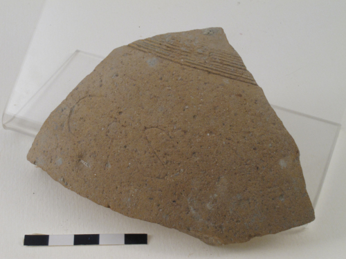 Parete (parte della spalla) di un anfora del tipo globulare altomedievale, probabilmente proveniente dallarea del Mediterraneo orientale. Distintive sono la decorazione sulla spalla con fasci di sottili incisioni parallele orizzontali e il graffito post-cocturam recante la sigla COS.
