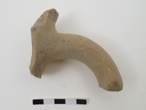 Frammento di ansa a gomito, con lattacco appena sotto il labbro, di anfora globulare altomedievale, probabilmente di area dellItalia meridionale. Il labbro, poco conservato, è a sezione circolare e leggermente estroflesso. Il frammento presenta lansa a bastoncello a sezione ellittica quasi circolare. Largilla è depurata e di colore crema con inclusi bianchi e nessuna mica. Il manufatto era schiarito in superficie.