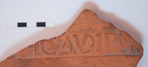 Tegola frammentaria della figulina Pansiana. Il Bollo è "Ti.CLAUDIPAN"(Tiberius Claudio Pansiana", età Claudia (41-54dC.). Bollo mutilo, ma bel leggibile. Manca la parte inziale del bollo con l'indicazione di "TI"(Tiberio). La tegola è frammentaria su tutti i lati. Altezza delle lettere del bollo 2,1 cm, larghezza massima lettere 1,4. Bollo del tipo 14g, secondo Zaccaria (a cura di) 1983; tipo 6/5 secondo Matijasic 1983.