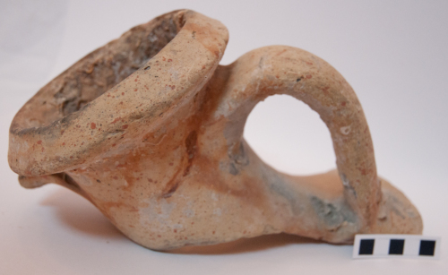 Ampia porzione di anfora di tipo greco-italico (età repubblicana) per il trasporto vinario. Il frammento riporta l'orlo completo, estroflesso a sezione triangolare. Il collo a sezione cilindrica, in questo esemplare piuttosto lungo, si imposta nettamente su una spalla leggermente carenata. L'ansa a bastoncello è a sezione ovoidale, è impostata un centimetro al di sotto dell'orlo e, in basso, direttamente sulla spalla. Argilla depurata beige ricca di miche. il corpo di queste anfore è a forma di pera, con un solido puntale finale. Capacità di 20-25 litri. Officine produttive di tali anfore erano diffuse sia nell'Italia tirrenica che adriatica, con presenze anche in area spinetico adriatica.