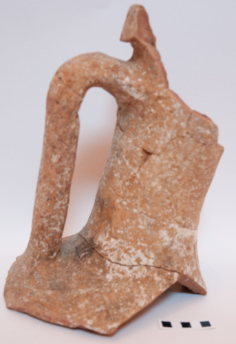 Ampia porzione di anfora di tipo greco-italico di tipo tardo (tipo D) (età repubblicana) per il trasporto vinario. Il frammento riporta l'orlo completo, estroflesso a sezione triangolare e scampanato. Il lungo collo a sezione cilindrica, si imposta nettamente su una spalla leggermente carenata. L'ansa a bastoncello è a sezione ovoidale, è impostata un centimetro e mezzo al di sotto dell'orlo e, in basso, direttamente sulla spalla. Argilla depurata nocciola ricca di miche, con cottura a sandwich. Il corpo di queste anfore è a forma di pera, con un solido puntale finale. Capacità di 20-25 litri. Officine produttive di tali anfore erano diffuse sia nell'Italia tirrenica che adriatica, con presenze anche in area spinetico adriatica.