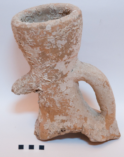 Porzione di anfora ad "Orlo ad alto imbuto", di produzione adriatica, con ogni probabilità del tipo II. Anfora caratterizzata da un orlo accentuato a forma di imbuto, distinto dal collo da una linea di demarcazione che da la forma di un "bicchiere" sopra il lungo collo. Le anse a bastone sono a sezione circolare/ellittica sono molto flesse con una andamento quasi verticale. Il corpo di tali anfore è generalmente ovoide. L'argilla è dura e di colore arancio-bruno. Abbondanti le incrostazioni di tipo marino, che denunciano un chiaro rinvenimento in ambiente acquatico
