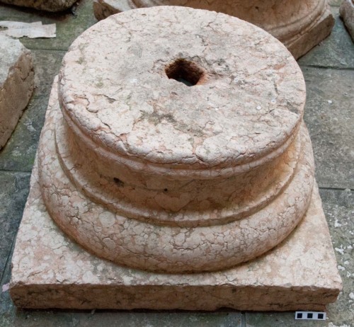 Base di colonna in broccatello rosso di Verona, con basso plinto rettangolare, e ampia scozia tra un torio semicircolare e una coppia di tori appena segnati. Il toro inferiore è molto spesso e tra questo toro e la scozia si distingue un listello. Presente un incavo pseudo quadrato per il fissaggio della colonna stessa, e un piccolo canalino per facilitare le operazioni di ammorsamento tra colonna e base. La base di colonna presenta stringenti confronti con le colonne di XIII secolo impiegate nel Chiostro di Santa Apollonia, adiacente alla fabbrica marciana. Può essere associata stilisticamente alle basi di colonna MAV 861, 863, 864, 866, 867, 868, 869.