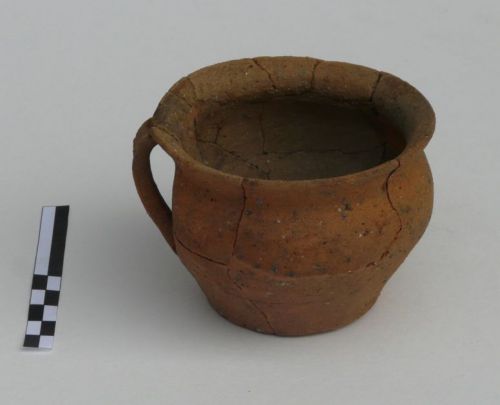orlo svasato obliquo, fondo leggermente convesso al centro; ansa a nastro sottile con incavo mediano