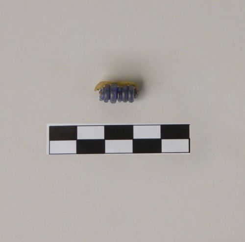 asticciola in ferro a sezione quadrangolare, nella quale sono infilati anellini circolari in vetro blu, di fattura irregolare