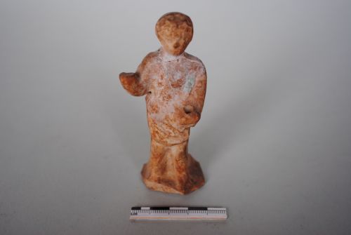 Statuina femminile stante in posizione frontale. Indossa una lunga tunica e un mantello drappeggiato. Volto e capigliatura sono consunti (matrice stanca). Con la mano destra regge una scodella, con quella sinistra la cassetta per l'incenso (?). Terracotta nocciola.