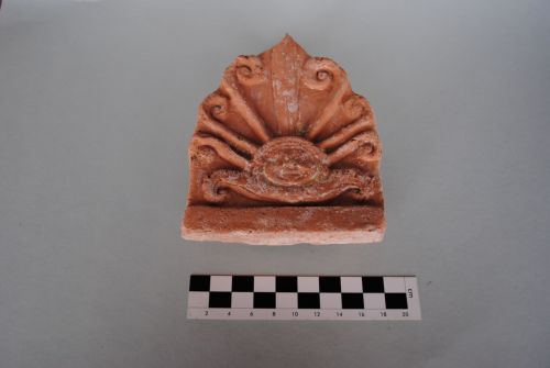 Antefissa di forma ogivale con base a listello, campita da una testa di gorgone larga e schiacciata, con capigliatura a lumachelle, entro palmetta a sette lobi terminanti in riccioli ricurvi all'interno. La testa poggia su un elemento vegetale a volute. Terracotta nocciola.