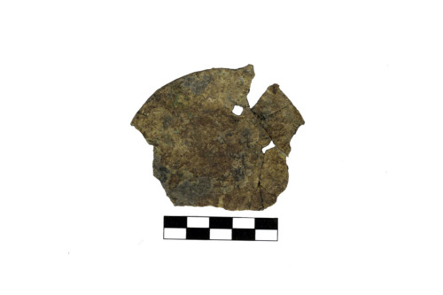 Sottile lamina circolare, forse di uno specchio, con foro rettangolare all'interno del cerchio, dalla circonferenza partono due corti prolungamenti forse per l'inserimento di un manico.