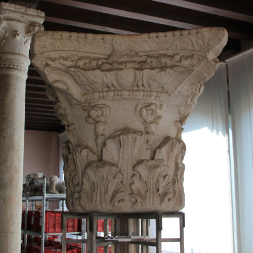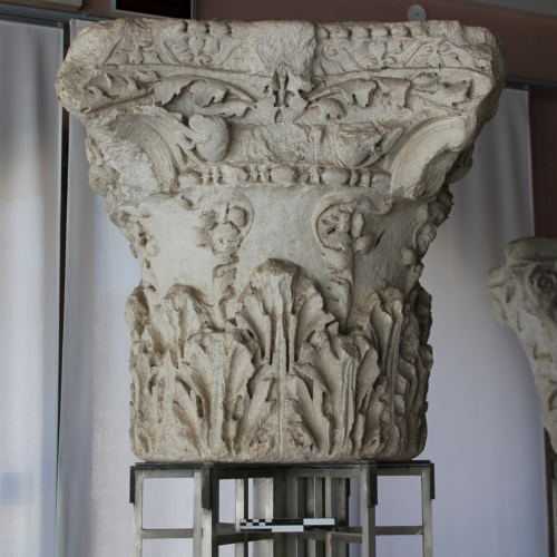 Il capitello è stato realizzato scolpendo un blocco di calcare bianco. E' decorato da due ordini di foglie d'acanto, sovrapposte le une alle altre, caratterizzate da una costolatura centrale con solcatura mediana. I lembi delle foglie sono frastagliati. Dal secondo ordine si alzano viticci, che portano fiori carnosi a quattro petali. Al di sopra di essi, una teoria di ovoli segnala il punto di passaggio alla parte superiore del capitello, dove si alternano diversi ordini di decorazioni vegetali, in cui l'acanto è affiancato da palmette e fiori.
