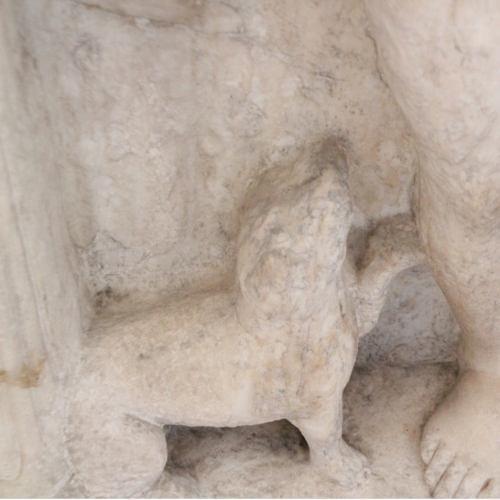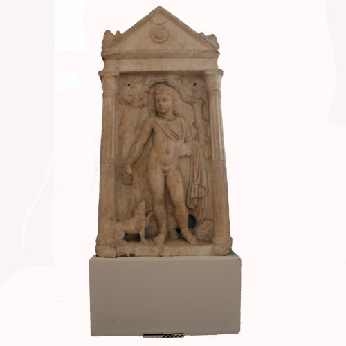 La stele appartiene ad un giovane, raffigurato mentre gioca con un cagnolino. Il volto del ragazzo, rivolto verso l'animale, in basso a destra, è costituito da un ovale pieno, le gote sono paffute ed il mento è rotondo. Il viso ha una fronte ampia e pienamente in luce, che sfuma dolcemente verso gli occhi, il cui sguardo appena in ombra, conferisce al viso un'espressione di pacata mestizia. Il naso diritto e appena schiacciato sulla punta e le labbra carnose sono tipiche dell'età infantile, a cui il defunto appartiene. La figura è stante: il peso del corpo poggia sulla gamba destra, mentre la sinistra è lievemente flessa indietro. Egli veste di una sola clamide che porta a partire dalla spalla destra, attorno al braccio sinistro. Sullo sfondo si colgono le fronde di un albero. La scena è inserita all'interno di un'edicola inquadrata da colonne in parte scanalate in parte rudentate e sormontata da un frontone con uno scudo a rilievo.