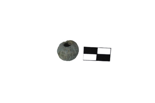 Perla/vago del tipo cosidetto "melonen perlen", a corpo sferico appena allungato, con ampio foro passante e con decorazione a costolature parallele, longitudinali, impresse. L'area di diffusione di questo tipo di vago è ampia: numerosi esemplari sono stati rinvenuti in Veneto, Trentino, nella zona del limes danubiano. Faïence di colore verde-azzurro.