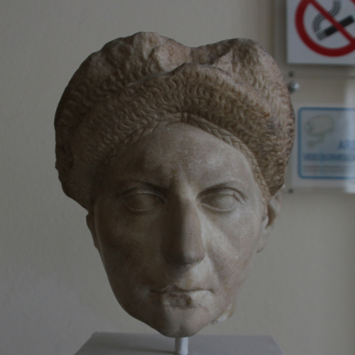 La testa ha viso dall'ovale affilato, smunto, in cui il modellato aderisce nettamente alla struttura ossea sottostante. La fronte è ampia e triangolare; gli occhi piccoli, con soppracciglia sollevate, conferiscono un'espressione di volitiva serietà al volto. Il naso aquilino e le labbra sottili della bocca identificano la testa come un ritratto realistico, attento alla cura dei tratti fisiognomici. L'acconciatura è molto elaborata e costituita da trecce che si dispongono in fasce e bande attorno al capo.