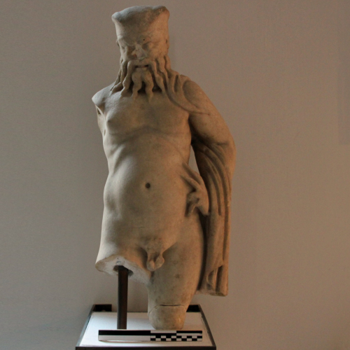 La statuetta è priva del braccio destro e di parte delle gambe. Ritrae una figura maschile, il cui viso è rivolto verso il basso. Esso ha un'espressione grottesca, accentuata da una stretta fronte, solcata da rughe profonde ed in parte coperta da una sorta di cuffia aderente. Ha soppracciglia corrugate e piccoli occhi vivaci. La bocca è piegata in una smorfia ed è quasi interamente coperta da una folta barba, costituita da ciocche che terminano a punta. La figura poggia il peso del corpo sulla gamba sinistra, mentre la destra è mollemente flessa in avanti. Indossa un himation che ricade sul braccio sinistro: questo lo sorregge poggiandosi sull'anca, fino a toccare con la mano l'ampia pancia rotonda.