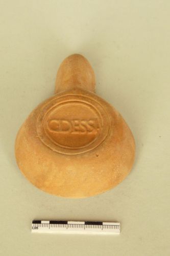 Lucerna in argilla arancio con canale aperto fino all'estremità del beccuccio (tipo Buchi x a). Sul disco, tra due infundibula disposti orizzontalmente, una maschera; due borchiette sulla spalla e piccolo foro nella zona centrale del canale. Sul fondo entro tre cerchi concentrici è il marchio C.DESSI, riferibile ad una officina norditalica attiva dalla pima metà del II al III secolo d.C.