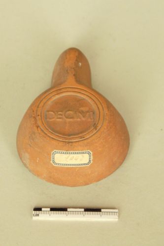 Lucerna a canale aperto fino all'estremità del beccuccio (tipo Buchi x a) in argilla arancio bruno con due fori di aerazione; foro di alimentazione leggermente decentrato verso il becco. Sul fondo, entro due cerchi concentrici, è il marchio DECIMI, riferibile ad una officina attiva agli inizi del II secolo d.C nell'Italia settentrionale e nella Pannonia.